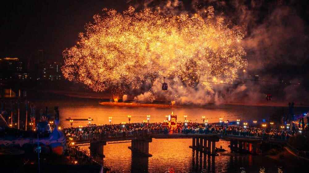 5月1日晚,游客在上海海昌海洋公园观赏烟花秀。(上海海昌海洋公园供图)