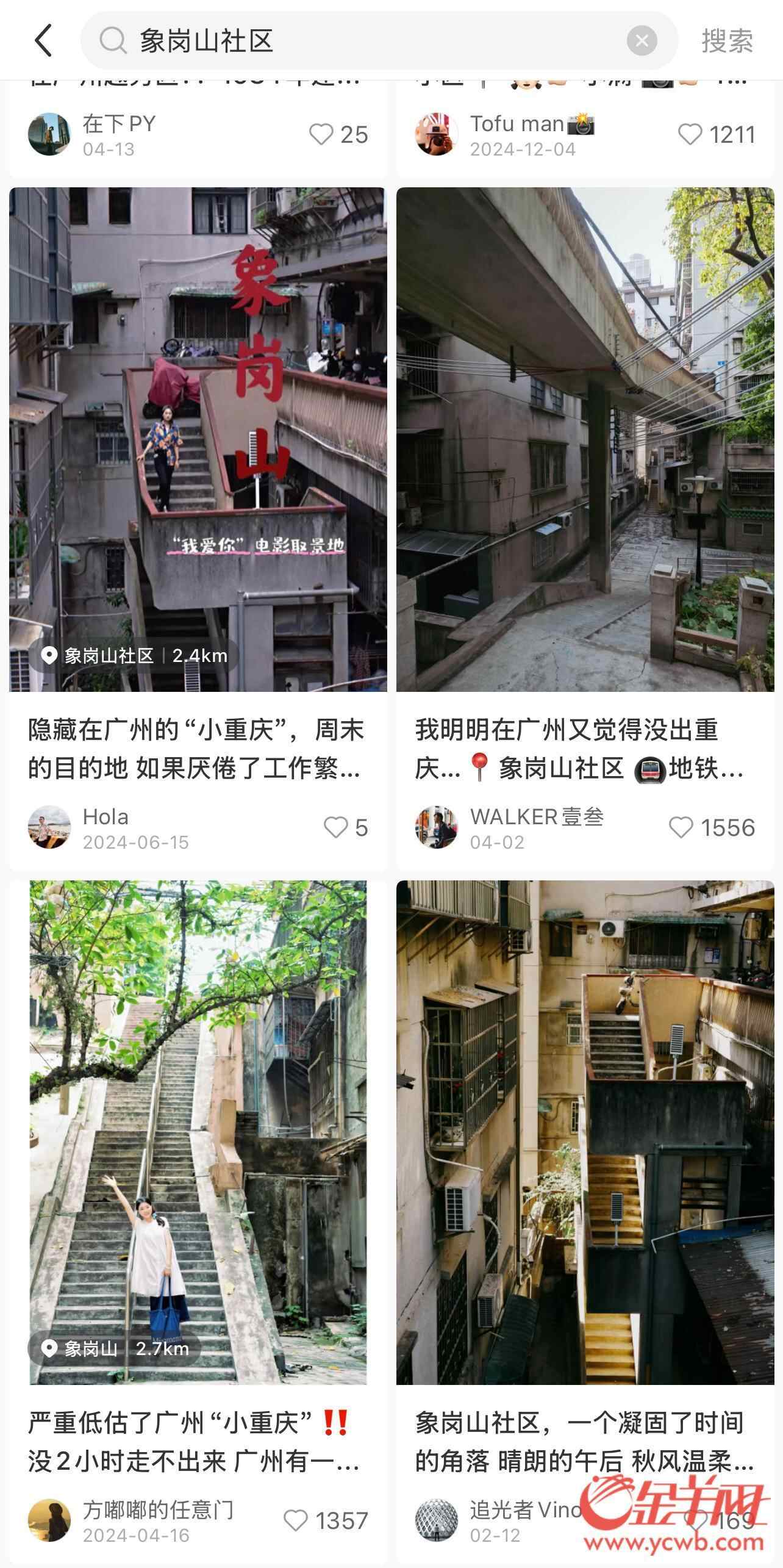 除了南越王墓和中国大酒店,影视作品及网友的自行发掘,也让“象山樵歌”焕发新活力。2023年电影《我爱你》公映后,细心网友发现影片其中一处取景地为广州象岗山社区。由于地势起伏,社区整体仍保持着上世纪80至90年代的风貌等因素,近年来该社区被网友称为“广州的小重庆”而走红,并持续吸引网友到访。