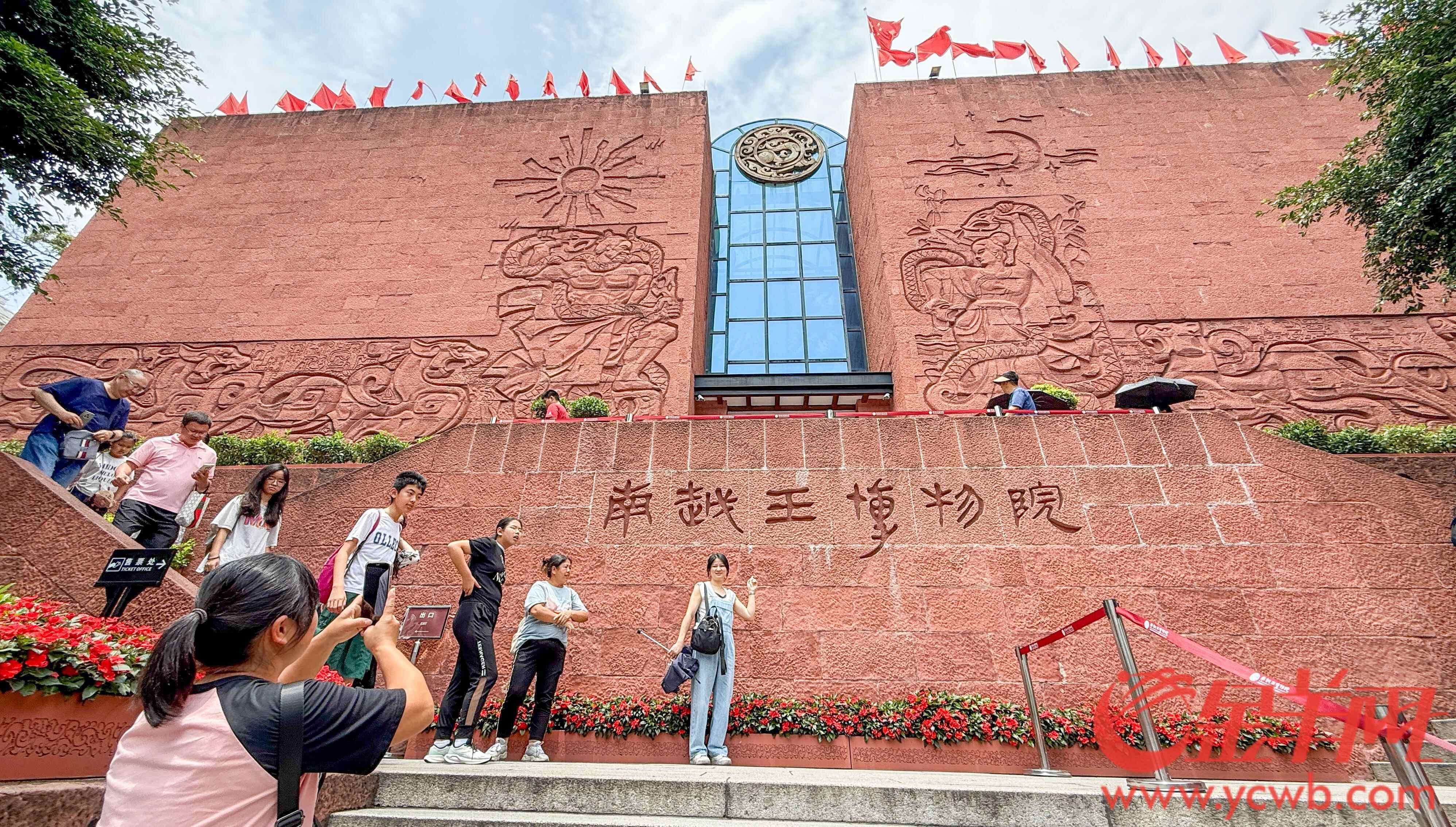 如今的越秀山,依然保留着绿美景观,吸引市民游客“五一”到访。相比越秀山,曾经的“象山樵歌”象岗山一带则早已被开发利用。这一开发利用,意外在1983年发现了埋藏在象岗山中赵佗之孙南越文王赵眜的陵墓,并在后续于陵墓原址建设了如今的南越王博物院(王墓展区)(以下简称“王墓展区”)。记者5月4日现场看到,不少游客来到王墓展区参观,并特意在展区门前的“南越王博物院”文字旁拍照留念。