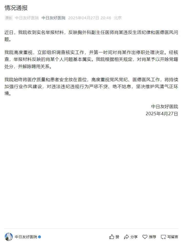 近日,北京中日友好医院胸外科副主任医师肖某被妻子举报婚内出轨多人。4月27日晚,医院通报称,举报基本属实,解除与肖某的聘用关系。