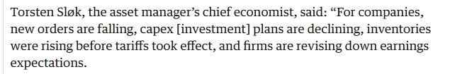文章援引美国阿波罗全球管理公司首席经济学家托斯滕·斯洛克的话说,自美国特朗普政府4月2日提出“对等关税”政策以来,企业新增订单量急剧下滑。当前,美国企业界正面临多重压力,如新增订单持续萎缩、资本支出计划缩减、关税生效前库存积压,而且各公司纷纷下调盈利预期。此外,美国家庭面临三方面压力,即消费者信心处于历史最低水平,关税政策实施前居民集中透支消费需求,旅游市场显著降温,其中出境游需求萎缩尤为明显。