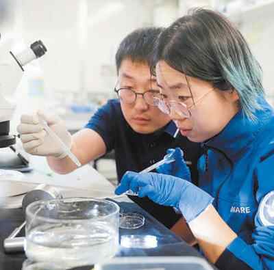 “雪龙2”号科考船上,考察队员迟旭朋(左)和武佳星在船载实验室对南极浮游生物进行分样。