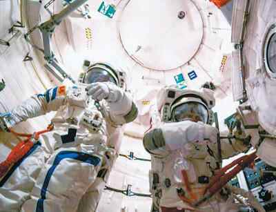 神舟十九号航天员蔡旭哲(右)、宋令东在做出舱准备。