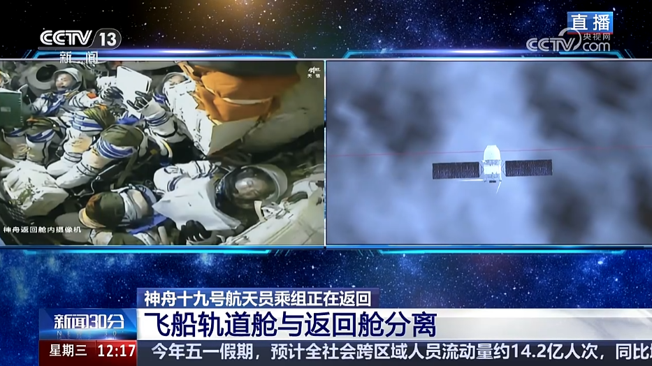 神舟十九号载人飞船轨道舱与返回舱成功分离,航天员蔡旭哲、宋令东、王浩泽踏上回家之路。