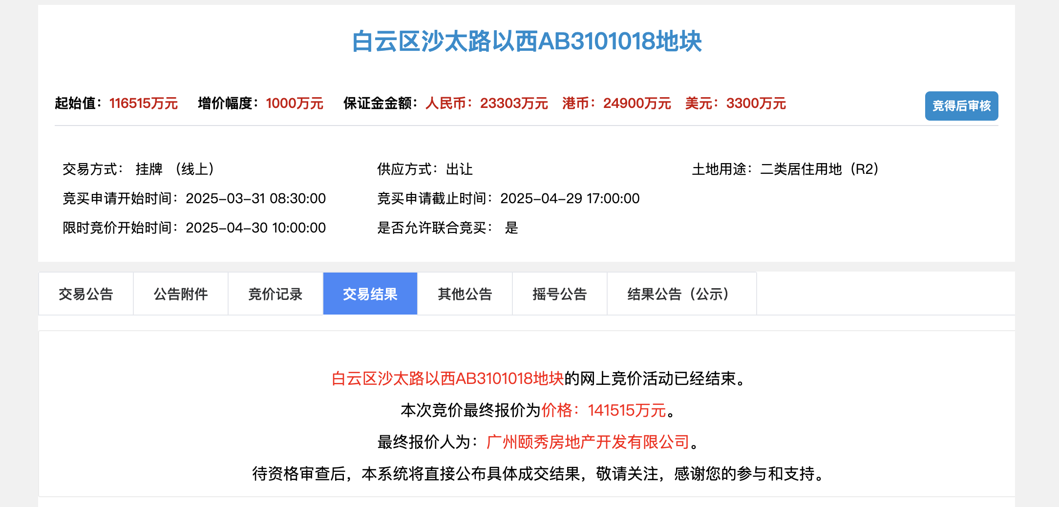 在五一假期前夕,广州土拍市场原计划出让四宗涉宅地,三宗位于白云区、一宗位于天河区,总起拍价达87.3亿元。其中,上午出让的沙太路以西AB3101018地块、嘉禾望岗AB2112039地块,以及下午出让的嘉禾望岗AB2112050地块,均被越秀地产旗下的公司竞得,三宗地块拿地价分别为14.15亿元、4.81亿元、6.49亿元,溢价21.5%、15.6%、18%,总成交价超25亿元。