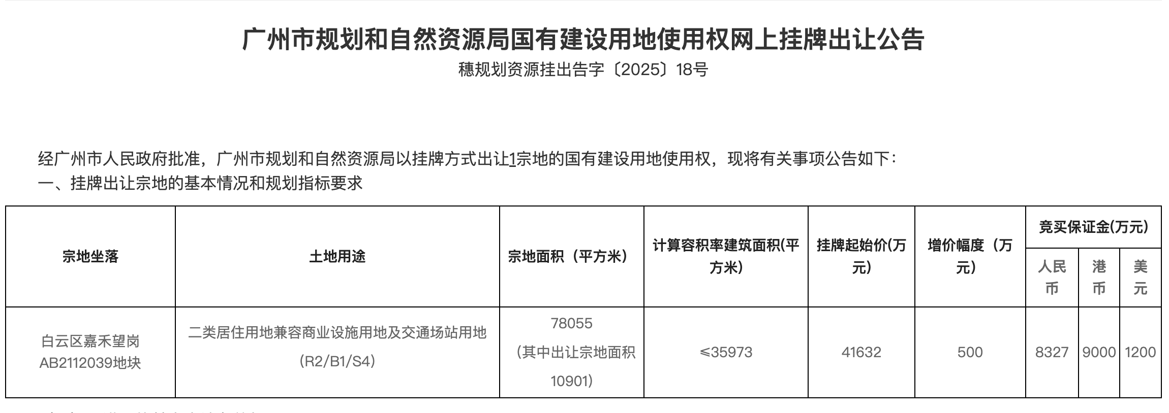 白云区嘉禾望岗AB2112039地块则为二类居住用地兼容商业设施用地及交通场站用地(R2/B1/S4),宗地面积为78055㎡,其中出让宗地面积10901㎡,计算容积率建筑面积≤35973㎡,挂牌起始价为41632万元,折合起拍楼面价为11573元/㎡。