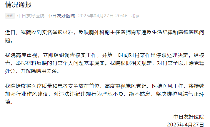 近日 ,北京中日友好医院通报胸外科副主任医师肖某违反生活纪律和医德医风问题一事基本属实,医院果断对其解除聘用关系 。这一事件引发了公众对医疗行业诸多问题的深入思考,尤其是对医学教育机制和教育公平的深刻反思。