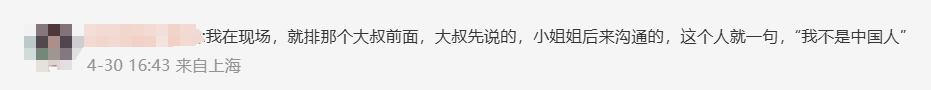 一位IP为上海的网友自称在现场,是视频中的大叔先劝的,女生后来再用英文沟通。