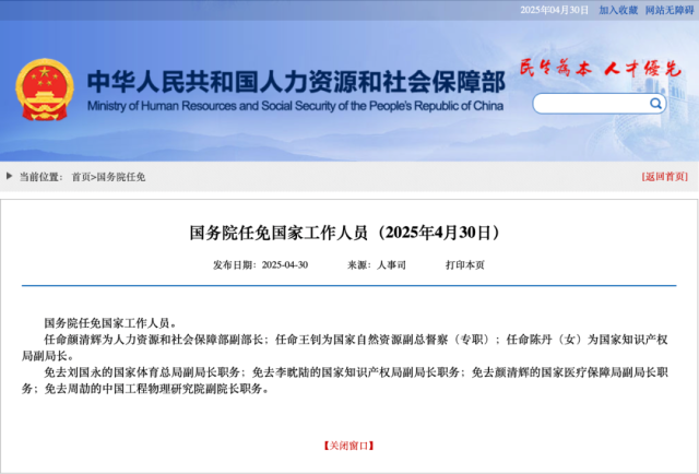 据人力资源和社会保障部网站4月30日消息,国务院任免国家工作人员: