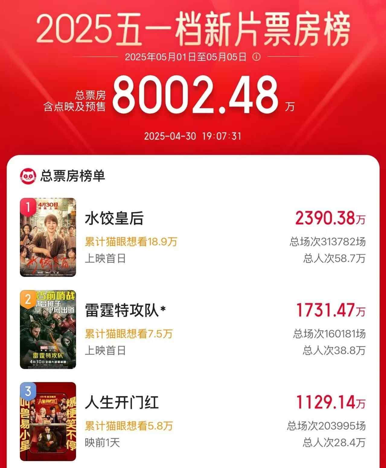 据网络平台数据,截至4月30日19时07分,2025年五一档总票房(含点映及预售)破8000万,《水饺皇后》《雷霆特攻队*》《人生开门红》分列新片票房榜前三位。