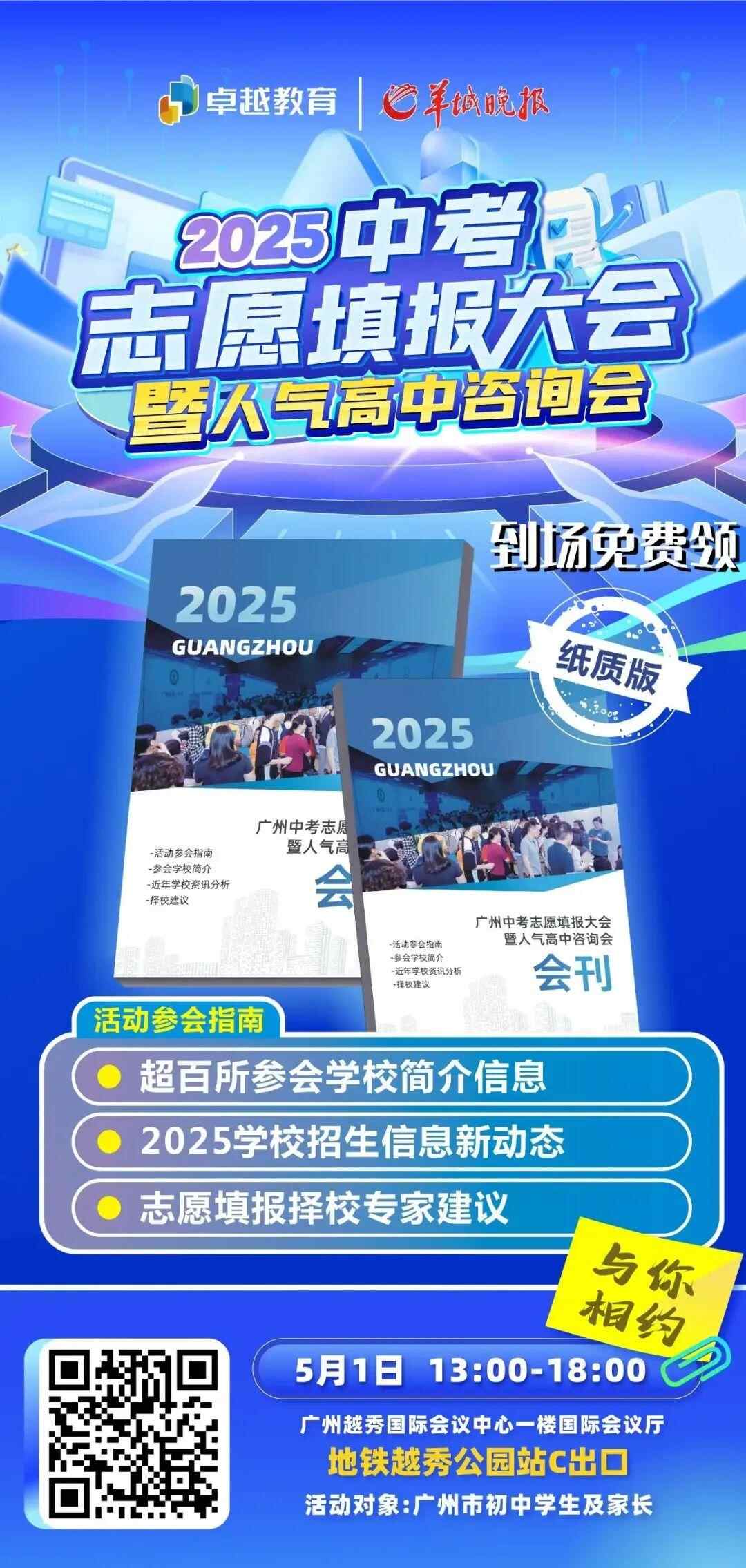 羊城晚报联合卓越教育重磅打造的“2025中考志愿填报大会暨人气高中咨询会”还有2天就要开启啦!110+所人气高中齐聚,11区政策研究专家现场答疑,现场还特设TOP17人气高中采访直播间。