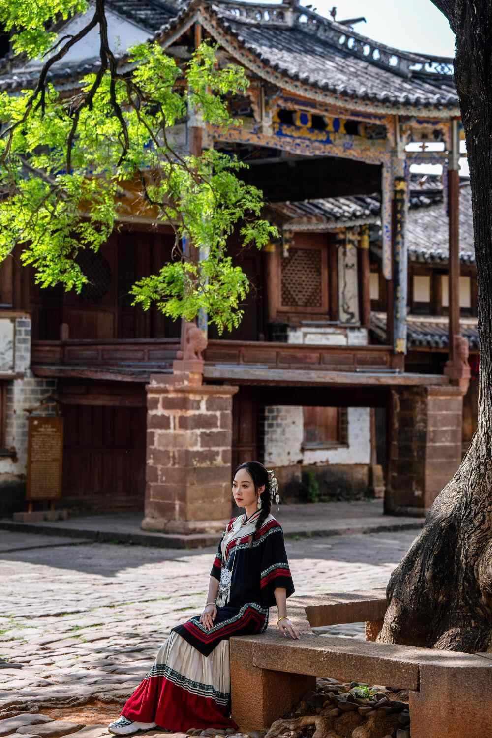 一名游客在云南省大理州沙溪镇寺登村古戏台前拍照留念(4月21日摄)。新华社记者胡超 摄