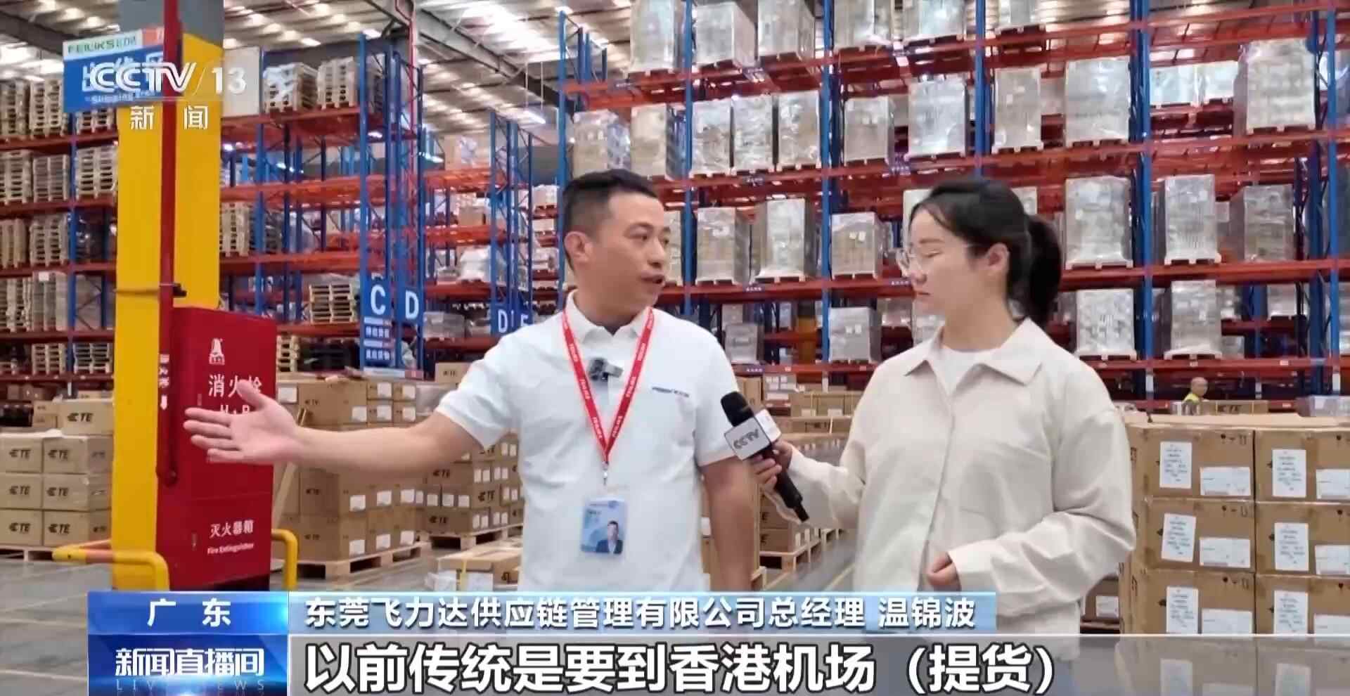 东莞飞力达供应链管理有限公司总经理 温锦波:以前传统是要到香港机场提货,现在不用拆包、不用申报,直接拉到空港中心,再进行一站式的进口申报。在我们家门口500米,就可以提回来仓库,非常方便。