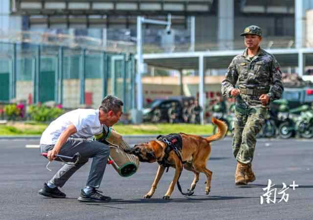 武警广东总队开展港澳青少年“同心同行·强国有我”进军营活动。图为警犬科目演示。