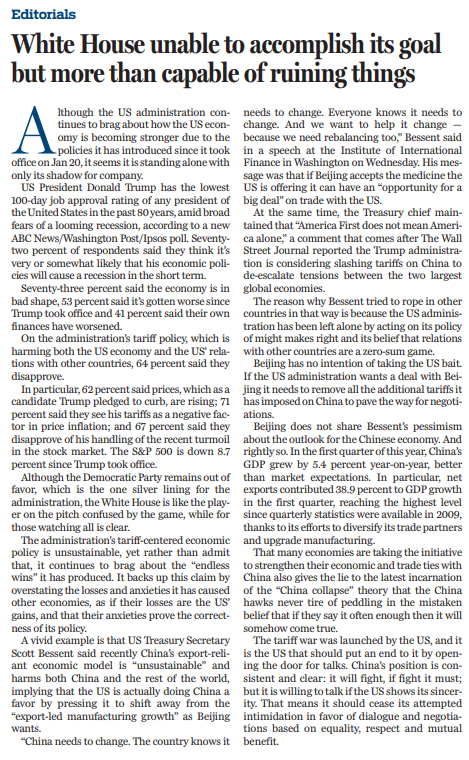 今年一季度,中国国内生产总值同比增长5.4%,好于市场预期,在全球主要经济体中名列前茅,延续了去年以来持续稳中向好、稳中回升的态势。其中,净出口对一季度国内生产总值增长贡献率为38.9%,达到2009年有季度统计数据以来的最高水平,这要归功于中国努力推动贸易伙伴多元化和推进制造业提质升级。许多经济体都在主动加强与中国的经贸联系,而美国滥施关税,损人害己,日益孤立。