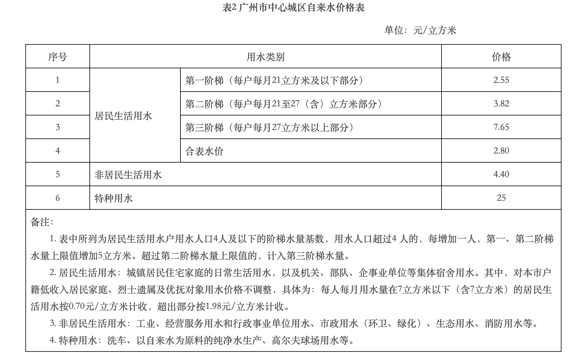 自2025年6月1日起,广州市中心城区自来水价格将进行调整,即居民生活用水第一、二、三阶梯价格调整为2.55元/立方米、3.82元/立方米、7.65元/立方米,并增设合表水价2.80元/立方米;非居民生活用水价格调整为4.40元/立方米;特种用水价调整为25元/立方米。