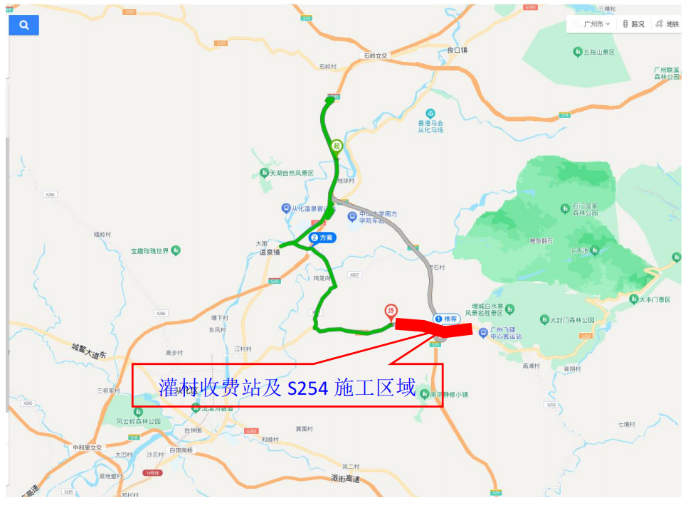 对灌村收费站实施交通引导,同时对省道S254线石坑村委至增城交界施工路段封闭一车道,采取单车道双向通行。