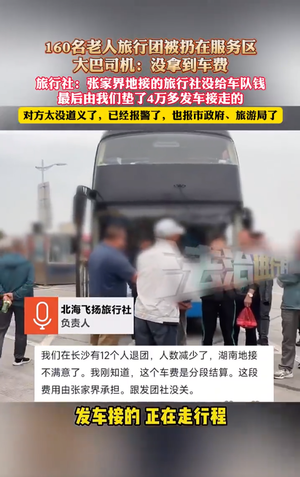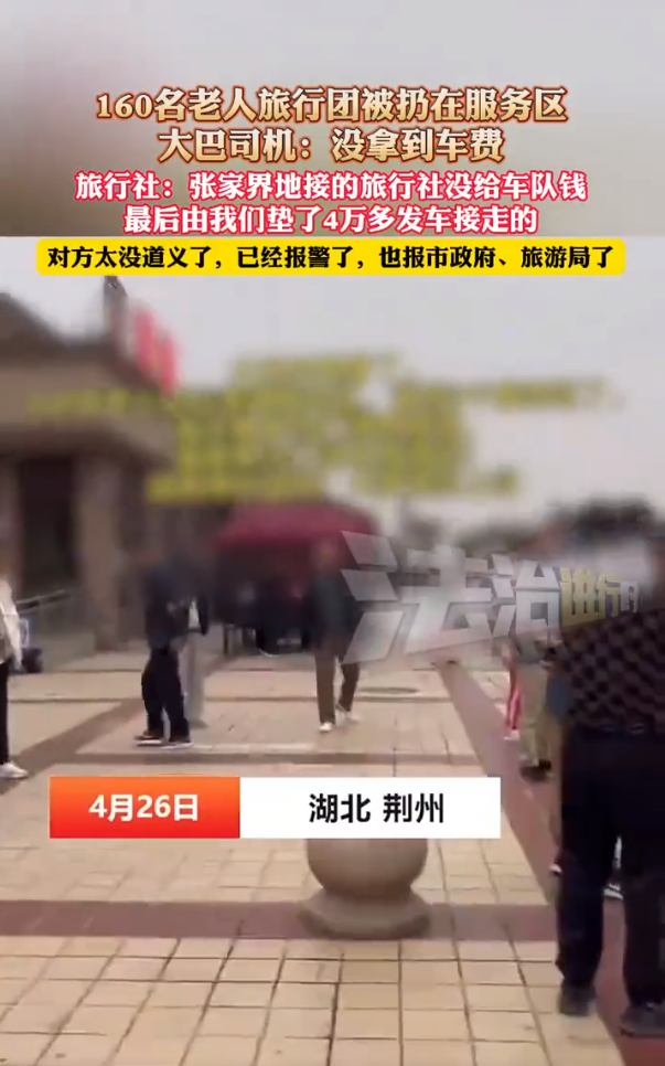 4月26日,有游客发视频称,在湖北荆州北海飞扬旅行社全额缴款报团旅游,大巴车司机却称没有得到车费,将160名老年游客丢在章庄铺高速服务区。