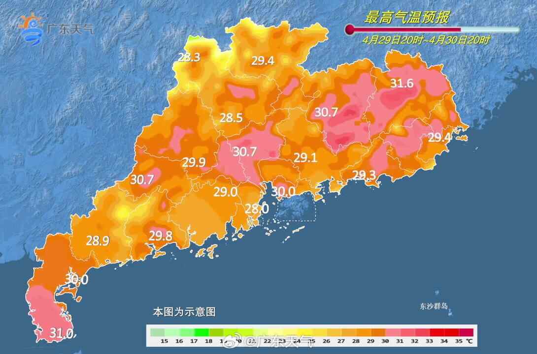◆预计,30日白天-5月1日白天,粤北、粤东和珠江三角洲北部市县有中到大雨,局部有暴雨并伴有6~8级短时大风和雷电;5月2日,广东省西南部市县有分散(雷)阵雨,其余市县以多云天气为主。未来三天,广东省大部市县早晚有(轻)雾。