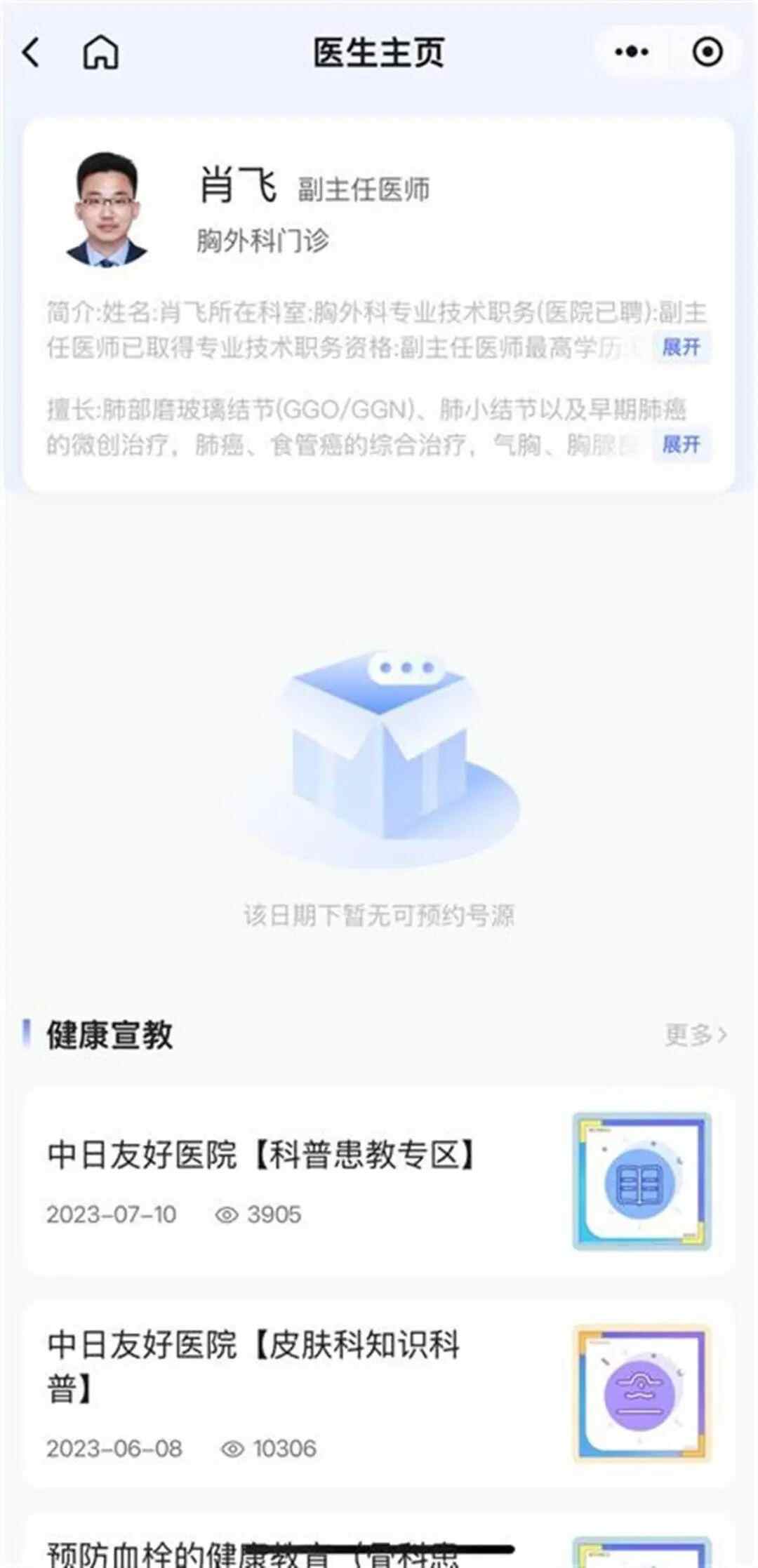 4月27日晚,记者注意到,中日友好医院官网仍有肖某的个人资料。记者登录该医院的微信小程序,仍能搜到肖某的个人信息,但预约挂号系统显示,其名下已无可预约号源。