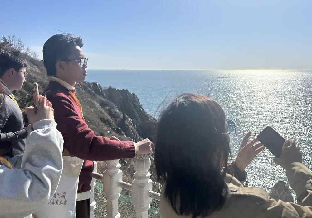 台湾学生简星宇(右二)与同学在大连旅顺老铁山观景台俯瞰黄渤海分界线(4月24日摄)。新华社记者 李妍 摄
