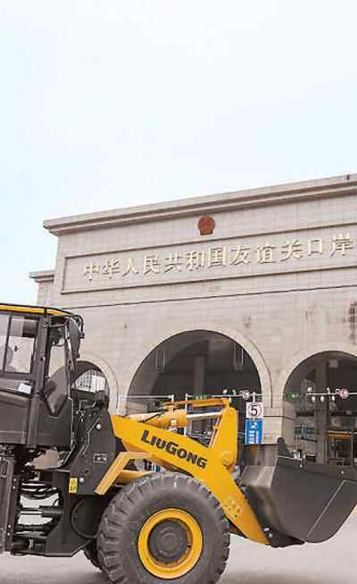在广西凭祥友谊关口岸,一批装载机驶过口岸出口越南。新华社记者 曹祎铭摄