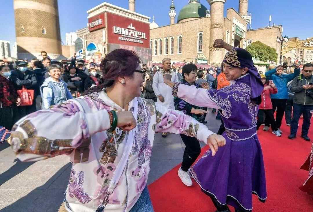 舞蹈演员与游客在大巴扎景区共同跳起舞蹈。
