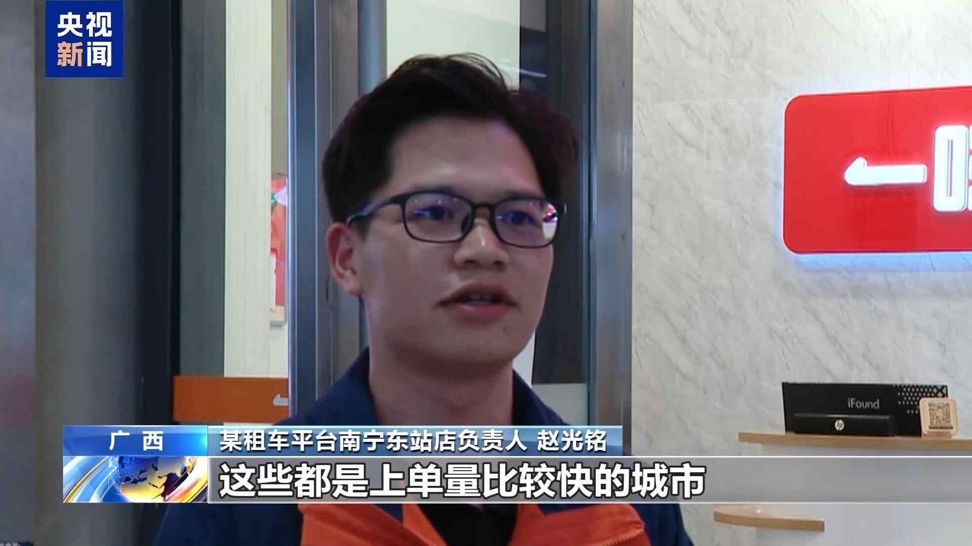 某租车平台南宁东站店负责人 赵光铭:南宁作为中心点,再到桂林、柳州、百色、崇左,这些都是上单量比较快的城市。从广西全区来看,预订量会有75%左右,部分城市已经达到了80%。