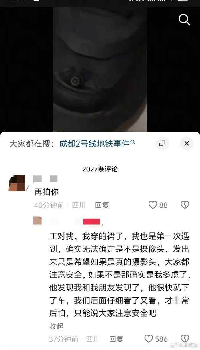 该网友与其他网友互动时称,自己当日身着裙子,乘坐成都地铁2号线时,注意到正对其的该男子形迹可疑,疑似在偷拍自己。由于是第一次遇见这种情况,她和友人正在疑惑,该男子就下车了,她事后想起很是后怕,遂发布此视频,也是想提醒其他乘客小心。