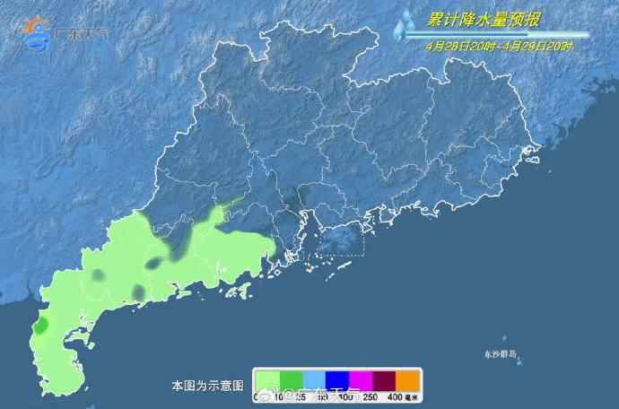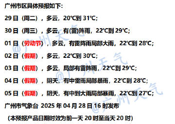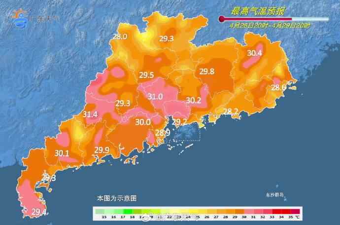 4月29日—4月30日白天,粤西、云浮和肇庆多云间阴天,有分散阵雨,其余市县多云,局部有阵雨。大部市县最高气温将介于29~33℃。