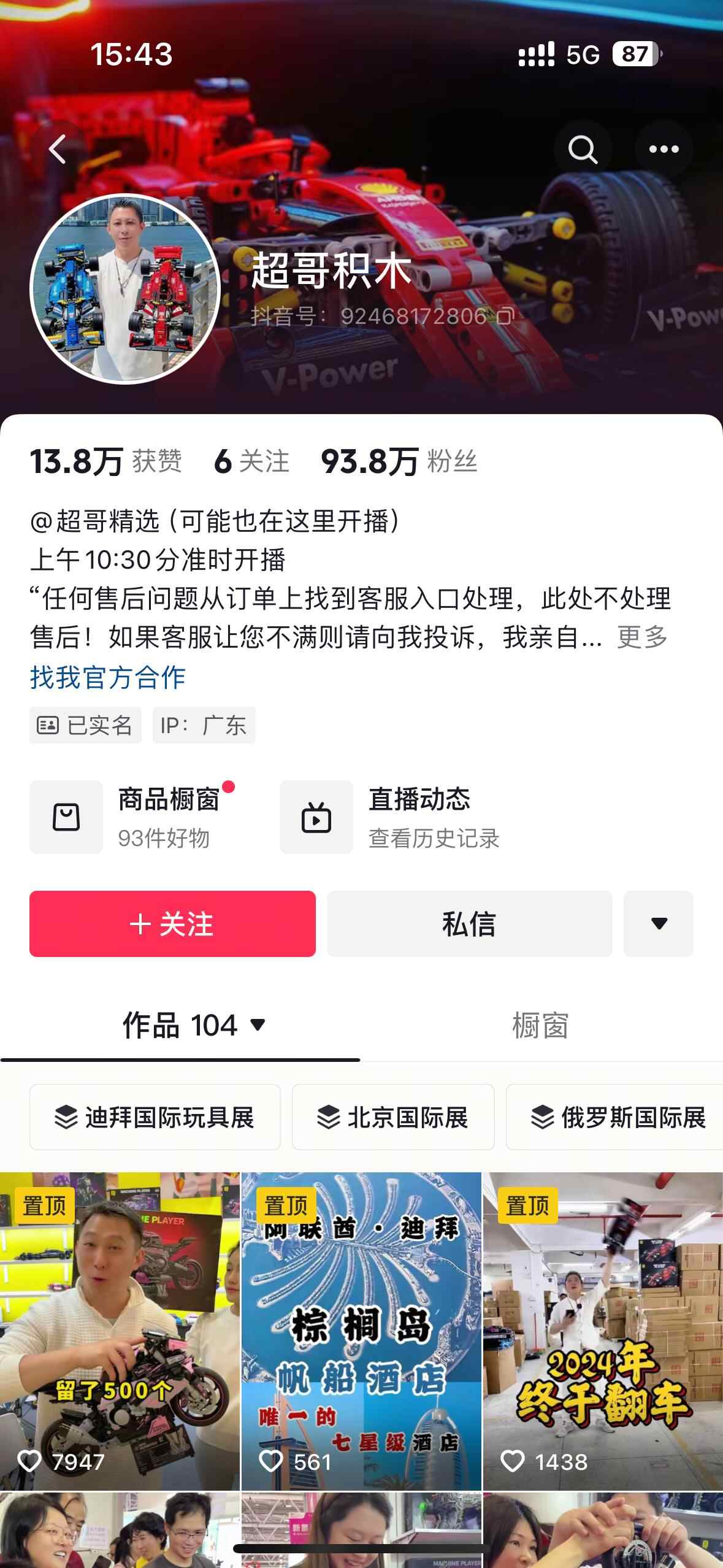 4月25日上午10:30,张鹏(超哥)准时打开抖音@超哥积木 开始直播,这次,他的直播背景从5天前的重庆国际玩具展到了第33届深圳礼品家居展。
