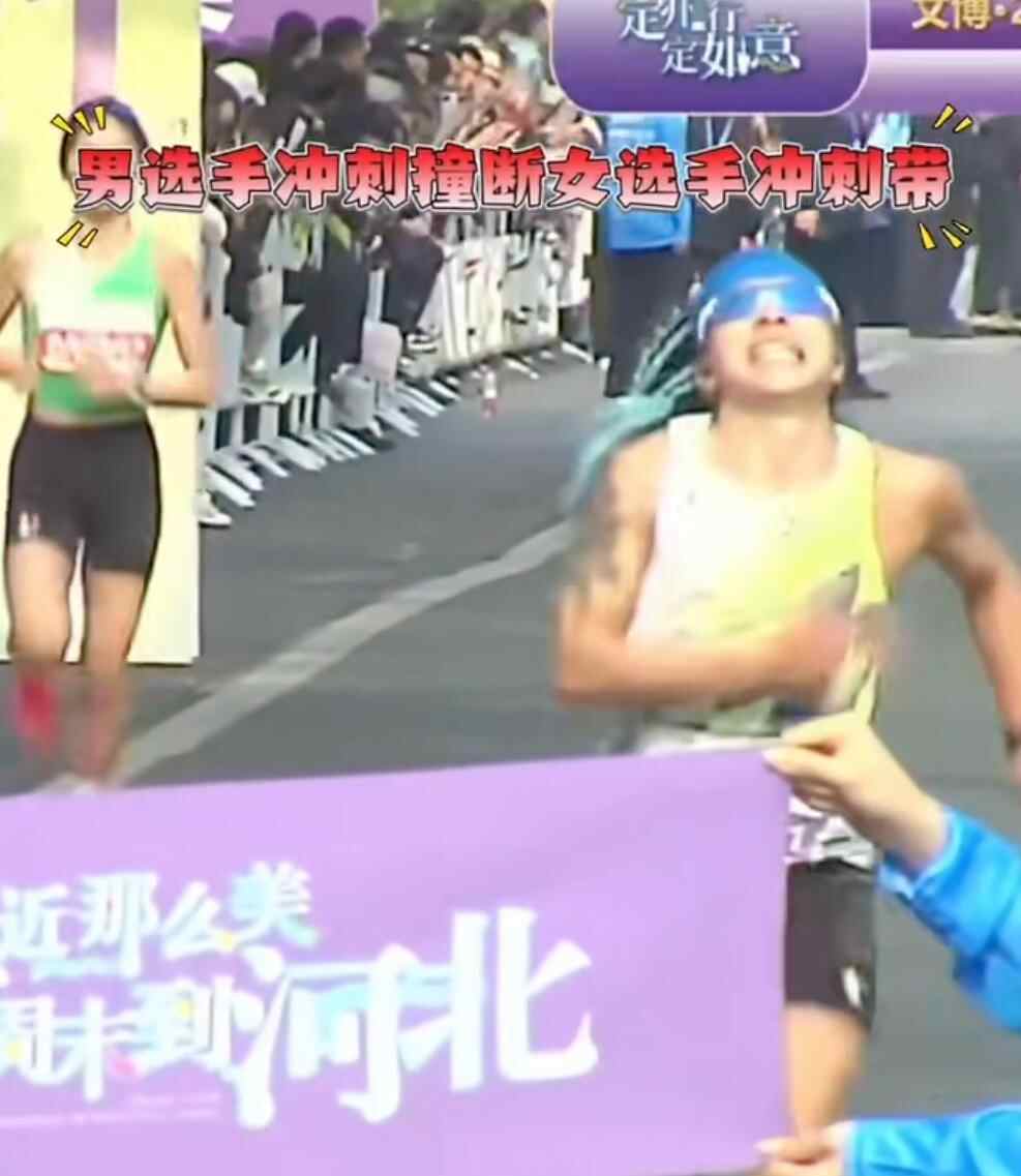 4月20日,河北定州半程马拉松赛场上,当女子冠军即将到达终点时,一名长发男选手却率先从女子冲线赛道完成冲线。之后志愿者立即重新拉起横幅,让女子冠军冲线。
