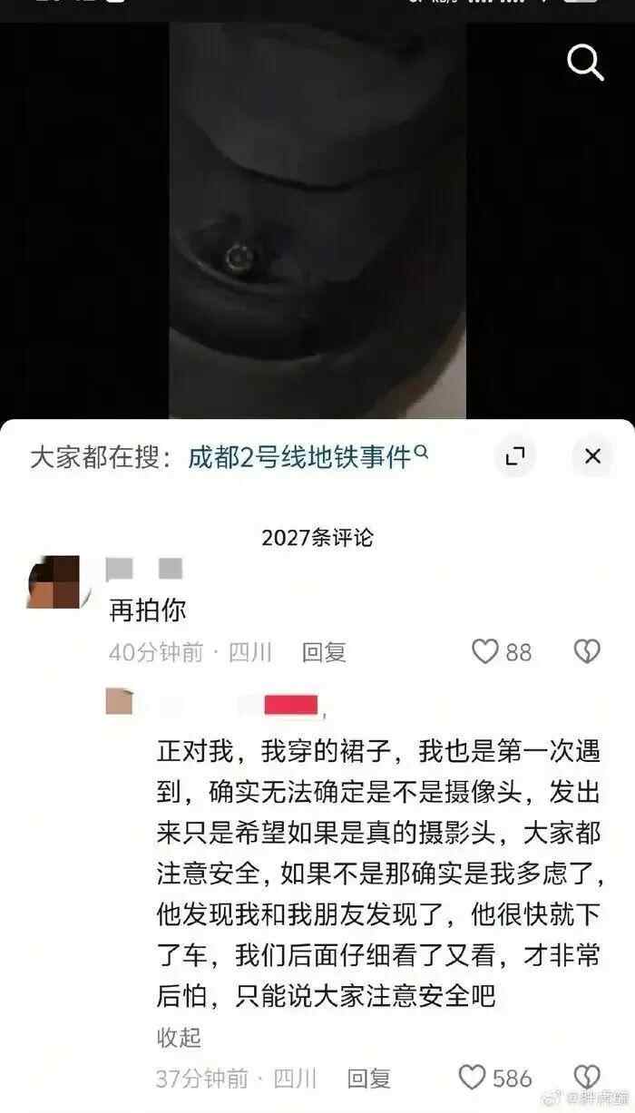 该网友与其他网友互动时称,自己当日身着裙子,乘坐成都地铁2号线时,注意到正对其的该男子形迹可疑,疑似在偷拍自己。由于是第一次遇见这种情况,她和友人正在疑惑,该男子就下车了,她事后想起很是后怕,遂发布此视频,也是想提醒其他乘客小心。
