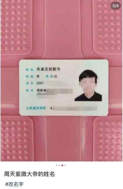 近日,湖南“00后”男生“朱雀玄武敕令”多次申请改名引发关注。他先是申请“周天紫微大帝”未果,4月26日下午又申请改为“朱咸宁”,27日中午再次申请更改为48个字“周天太上开天执符御历含真体道金阙云宫九穹御历万道无为大通明殿昊天金阙至尊玉皇赦罪大天尊玄穹高上帝”,还有一个备选名字“周武王”。