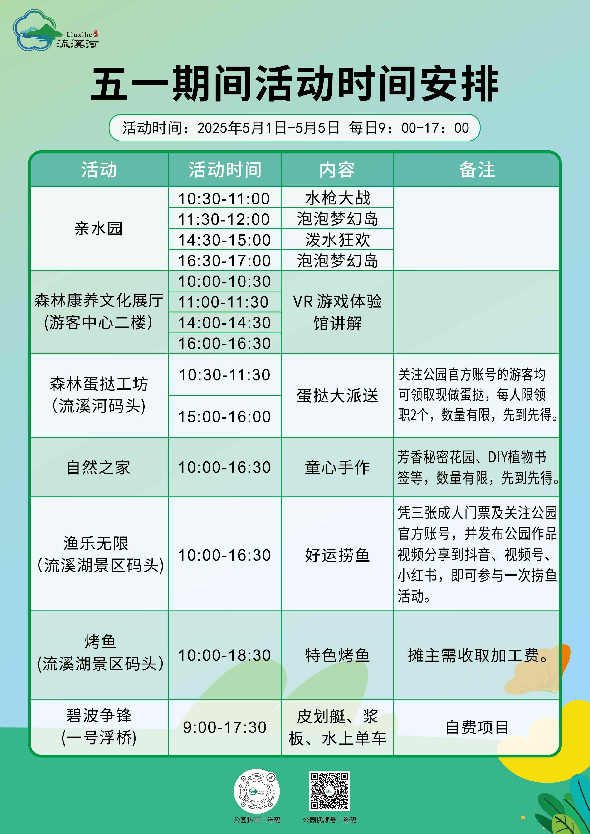 作为流溪河国家森林公园全新打造的亲子玩水地标,5月1日至5月5日期间,亲水园每日10:00-16:30将开放“水战狂欢”活动,包括水枪大战、泼水派对、泡泡梦幻乐园、水上篮球等免费互动游戏,让孩子尽情释放天性、家长重温童年乐趣。