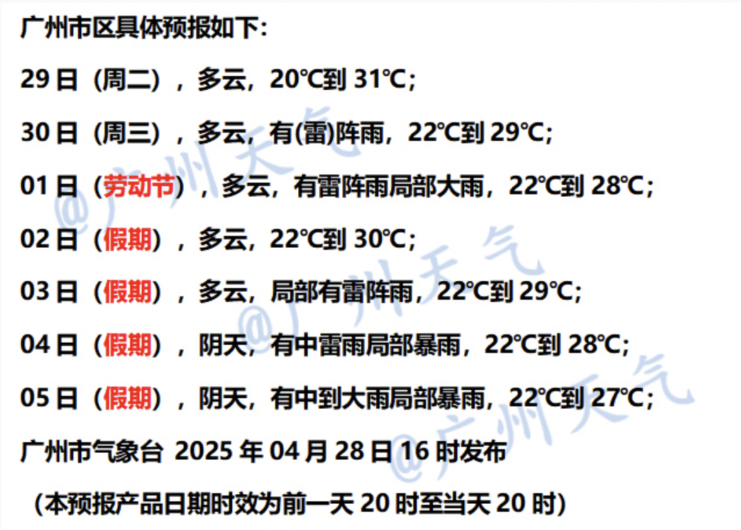 根据广州市气象台4月28日预计,“五一”假期广州降水频密。按现有气象资料预计,除5月2日外,假期其余日子均有降水,其中4日和5日有局部暴雨。