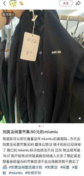近日,演员刘美含在社交平台发起“闲置流通计划2.2市集”引发关注。有消费者发帖称,自己在刘美含闲置集市购得疑似仿冒的MIUMIU针织衫和LV背包。
