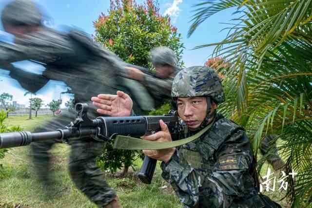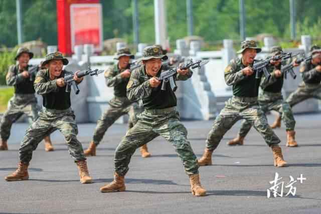 在武警广东总队珠海支队“红色前哨连”,武警广东总队开展港澳青少年“同心同行·强国有我”进军营活动。图为刺杀操表演。