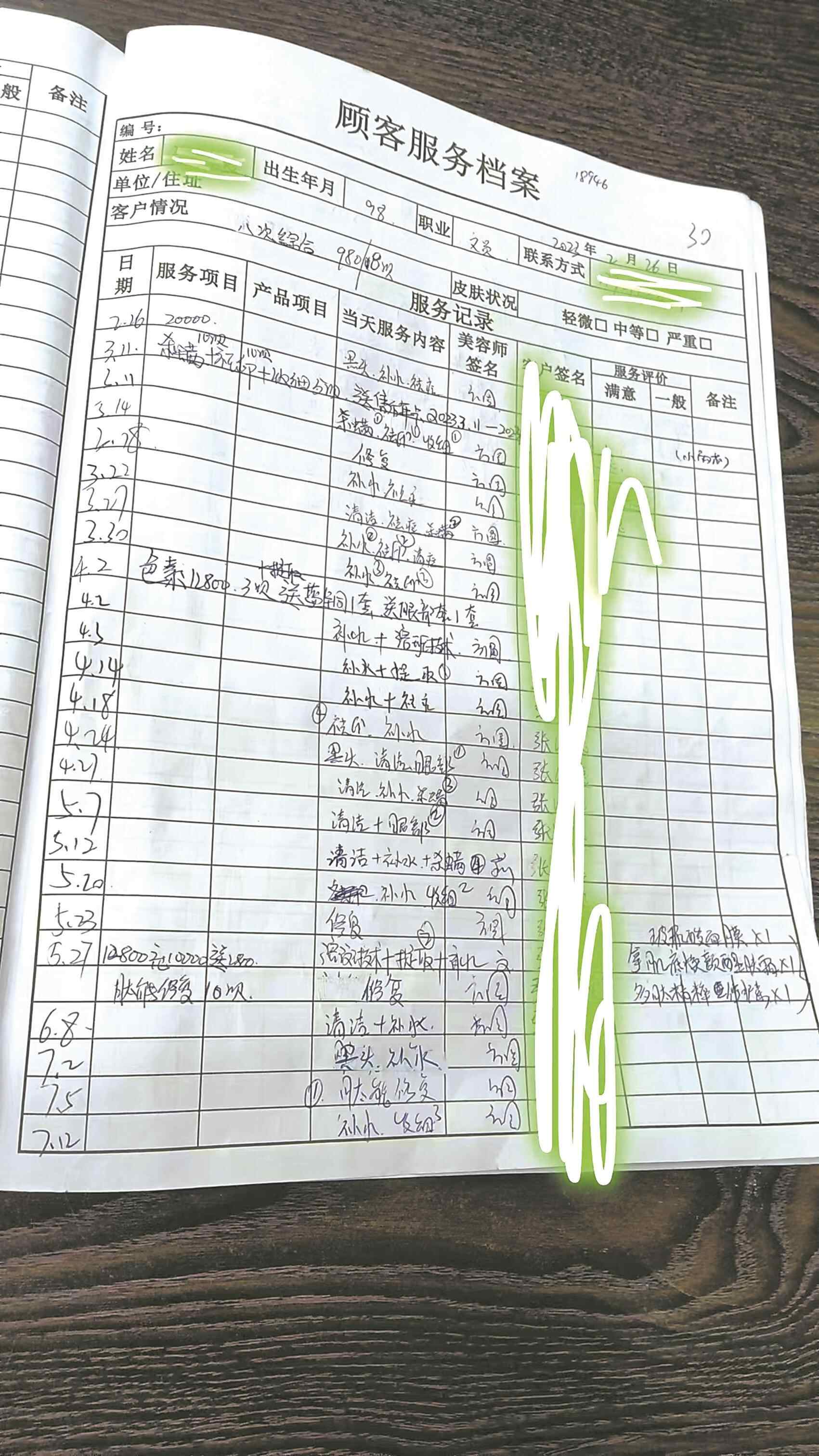 不到百元一次的护理听起来还算划算,小张购买后成为了这家店的消费连环升级的“回头客”。自那以后,她在店内人员的强力推销下陆续购入了价值2万元的“毛孔收细套餐”、12800元的“色素套餐”、1万元的“肽能修复”项目以及一张1万元的“油脂管理年卡”。