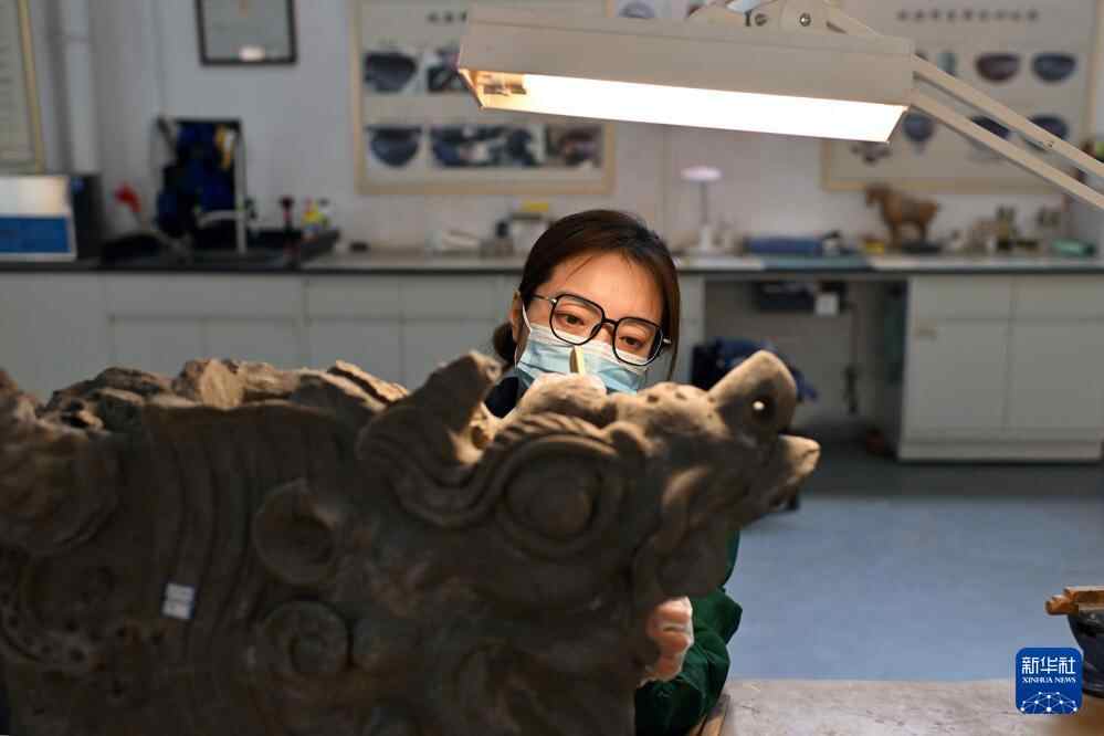 4月15日,在云冈研究院可移动文物修复室,工作人员孙丽娜在进行除尘作业。