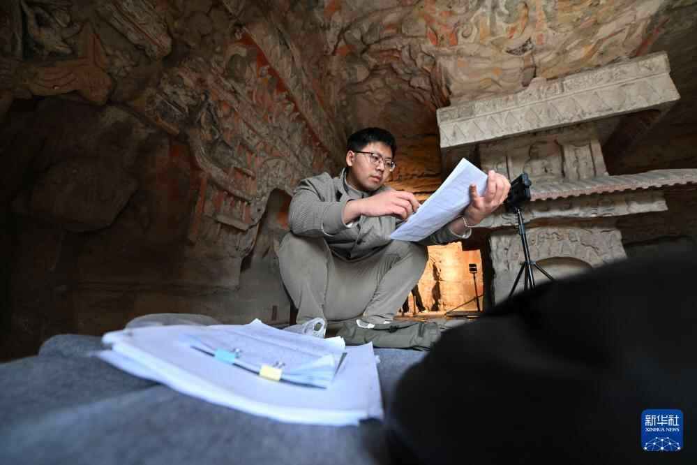 4月16日,在云冈石窟,工作人员在进行考古调查。