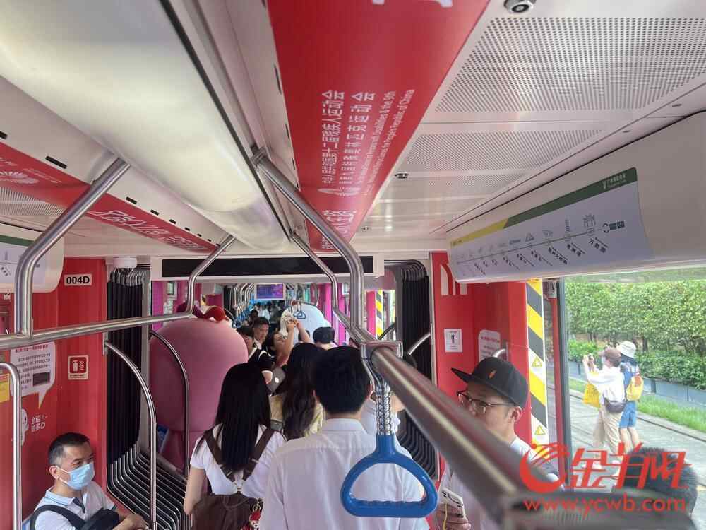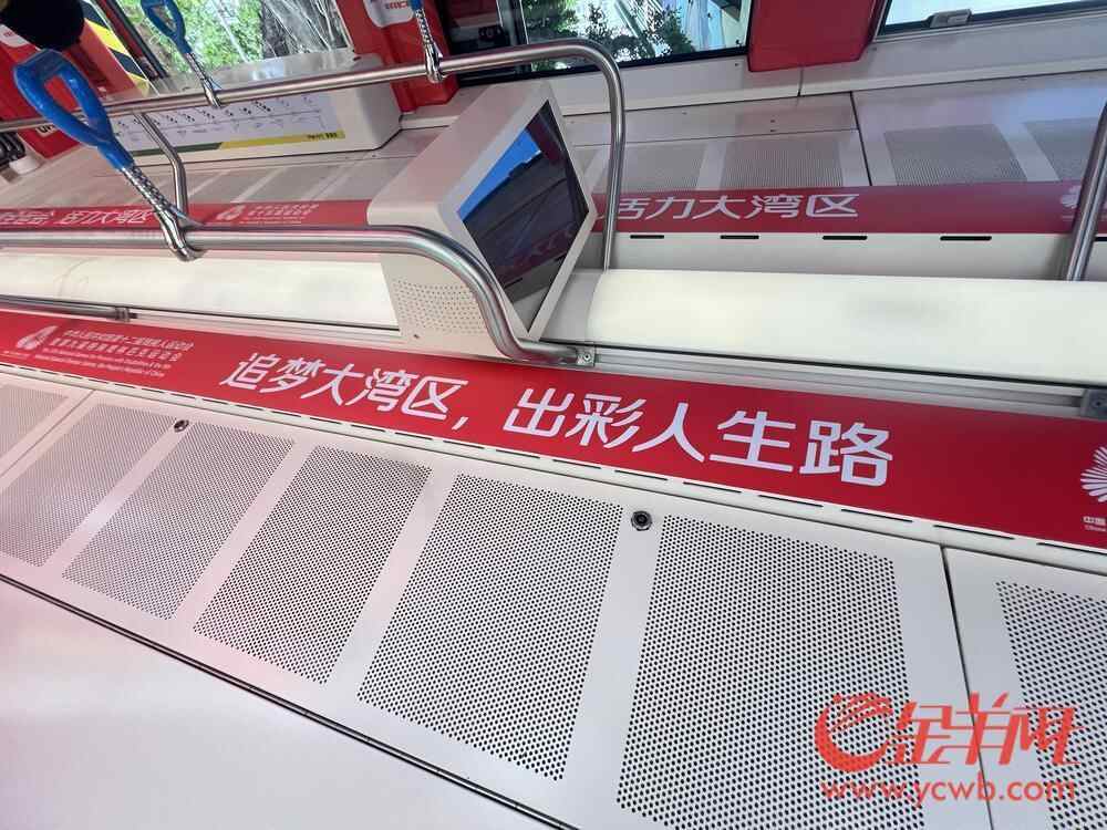 记者在车上看到,车厢内部通过地贴、天花、车窗、电视等多元载体,打造沉浸式全运科普空间。地面贴有广东奥林匹克体育中心、广州天河体育中心、广州体育馆、广东省人民体育场等全运赛事场馆,并嵌入“办好一个会,提升一座城、彰显一座城、幸福一座城”等标语;天花张贴“激情全运会,活力大湾区”“追梦大湾区,出彩人生路”等口号;车厢内部两侧则是十五运会和残特奥会吉祥物“喜洋洋”“乐融融”和广州地铁吉祥物“悠悠”的互动画面,科普历届全运会小知识、赛事项目、举办城市、趣事等相关知识。