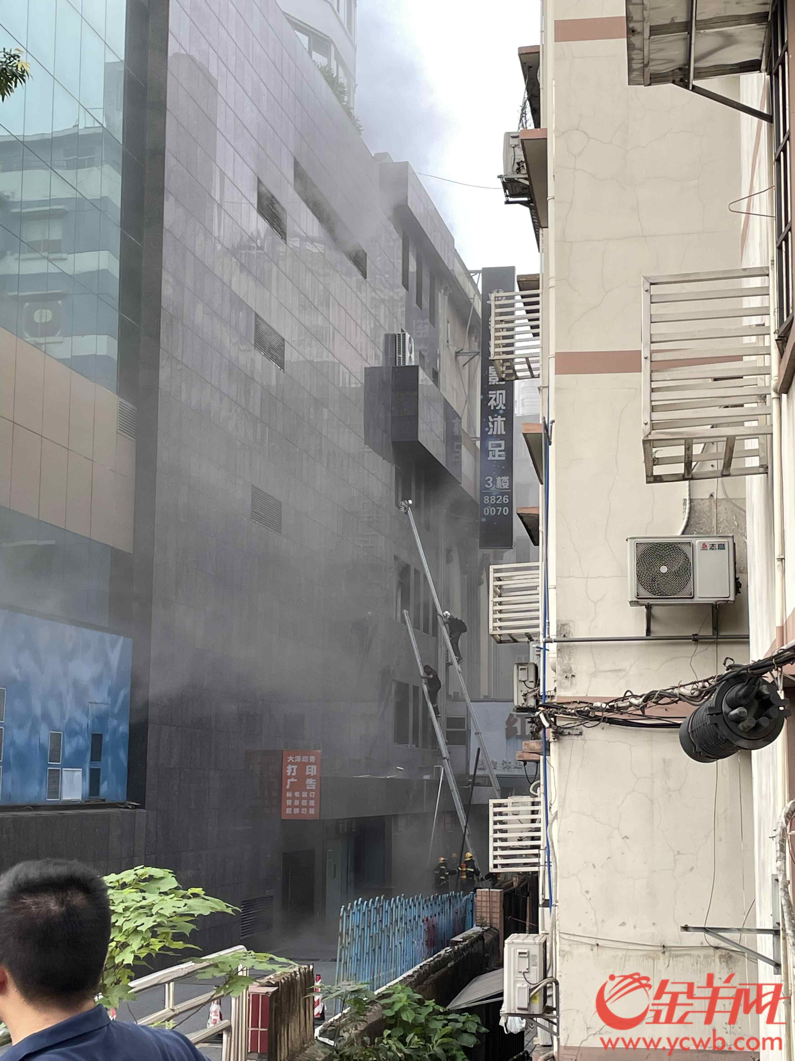 记者在现场闻到,有一阵烧焦味不断飘出。消防梯架设在三楼、四楼,消防员带领楼里的人员向外部爬出。