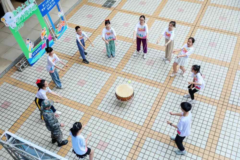 第三项目“团队素质拓展”将赛事推向高潮。进入第二赛程的选手通过鼓动飞扬、合力搭建、袋鼠跳等环节,展现体能、协作与领导力。参赛选手们在碰撞中达成共识,在合作中凝聚智慧,彰显了大湾区新时代青少年的活力与能量。