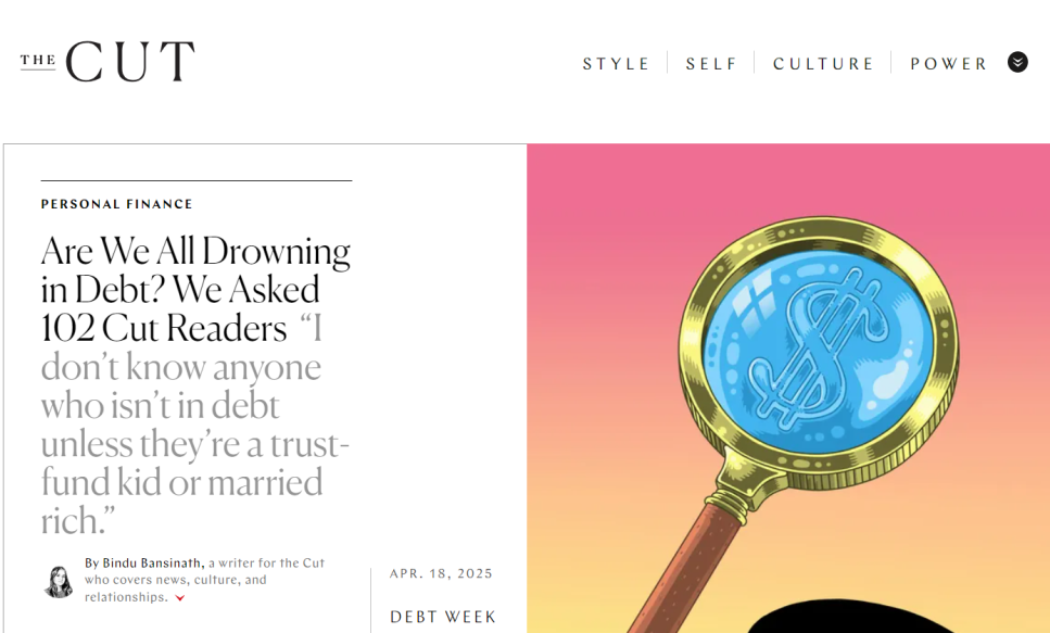 The Cut调查发现,多数受访者因信用卡过度消费而欠债,最常见的债务范围在2.1万美元至5万美元之间。高利率的信用卡债务让许多人陷入“以债养债”的恶性循环,他们用“利息的仓鼠轮”来形容其背负债务。他们借新债还旧债,利息却像滚雪球般越积越多,只能永无休止地偿还最低还款额。