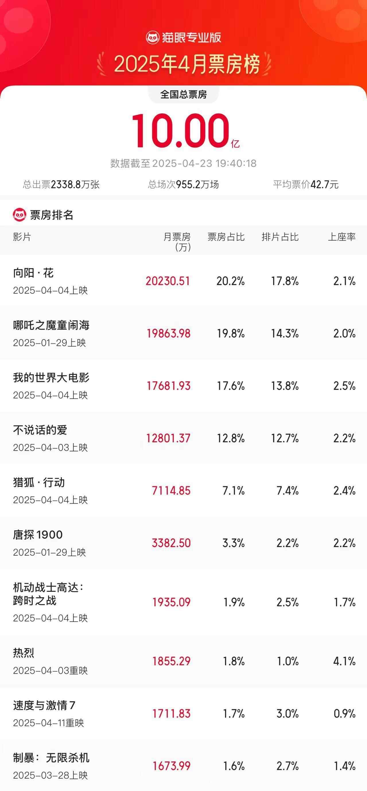 2025年4月电影总票房破10亿