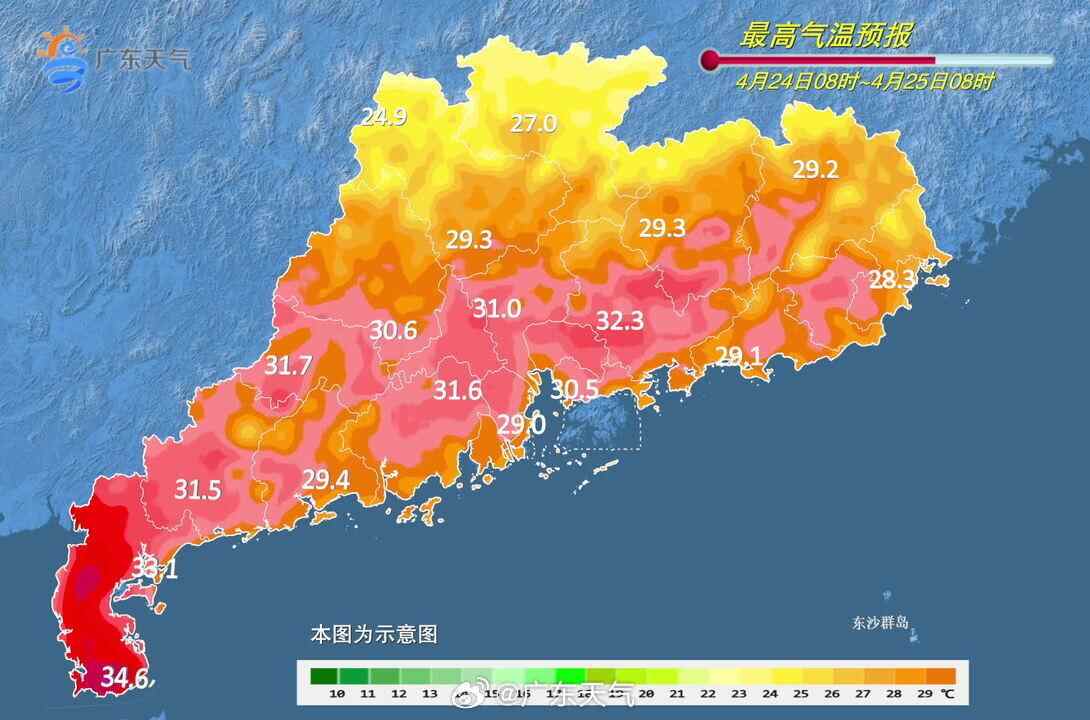 ◆24日,韶关和清远市县阴天有暴雨局部大暴雨,河源、梅州北部、珠江三角洲北部市县雷阵雨转暴雨局部大暴雨,珠江三角洲中南部和粤西的北部市县多云到阴天,有中到强雷雨,其余市县多云到阴天,有分散(雷)阵雨。最高气温:雷州半岛34~36℃,粤北和珠江三角洲北部市县25~28℃,其余市县29~32℃。