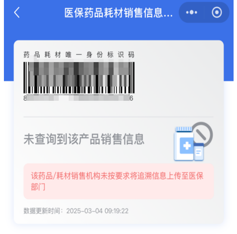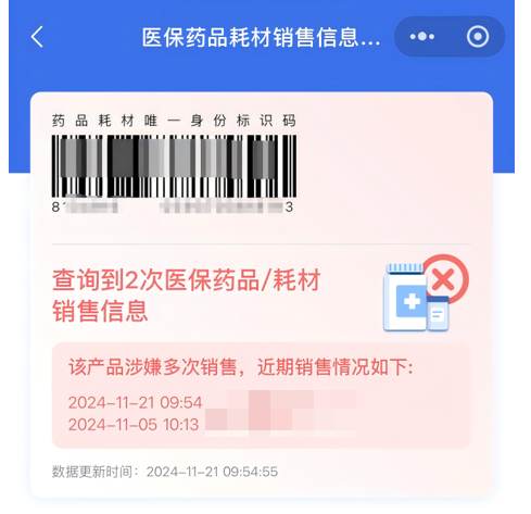 但是,界面如果提示“未查询到该产品销售信息”,则说明该药品销售机构未按要求将追溯信息上传至医保信息平台,患者可以要求该药品销售机构出示药品来源单据,以确保药品安全和来源渠道合法;界面如提示“查询到多次医保药品/耗材销售信息”并显示出最近几次的销售记录,该情况说明被查询产品涉嫌多次销售,群众可依据此信息按照《中华人民共和国药品管理法》《中华人民共和国消费者权益保护法》相关条款要求,向销售此药品的定点医药机构索赔。