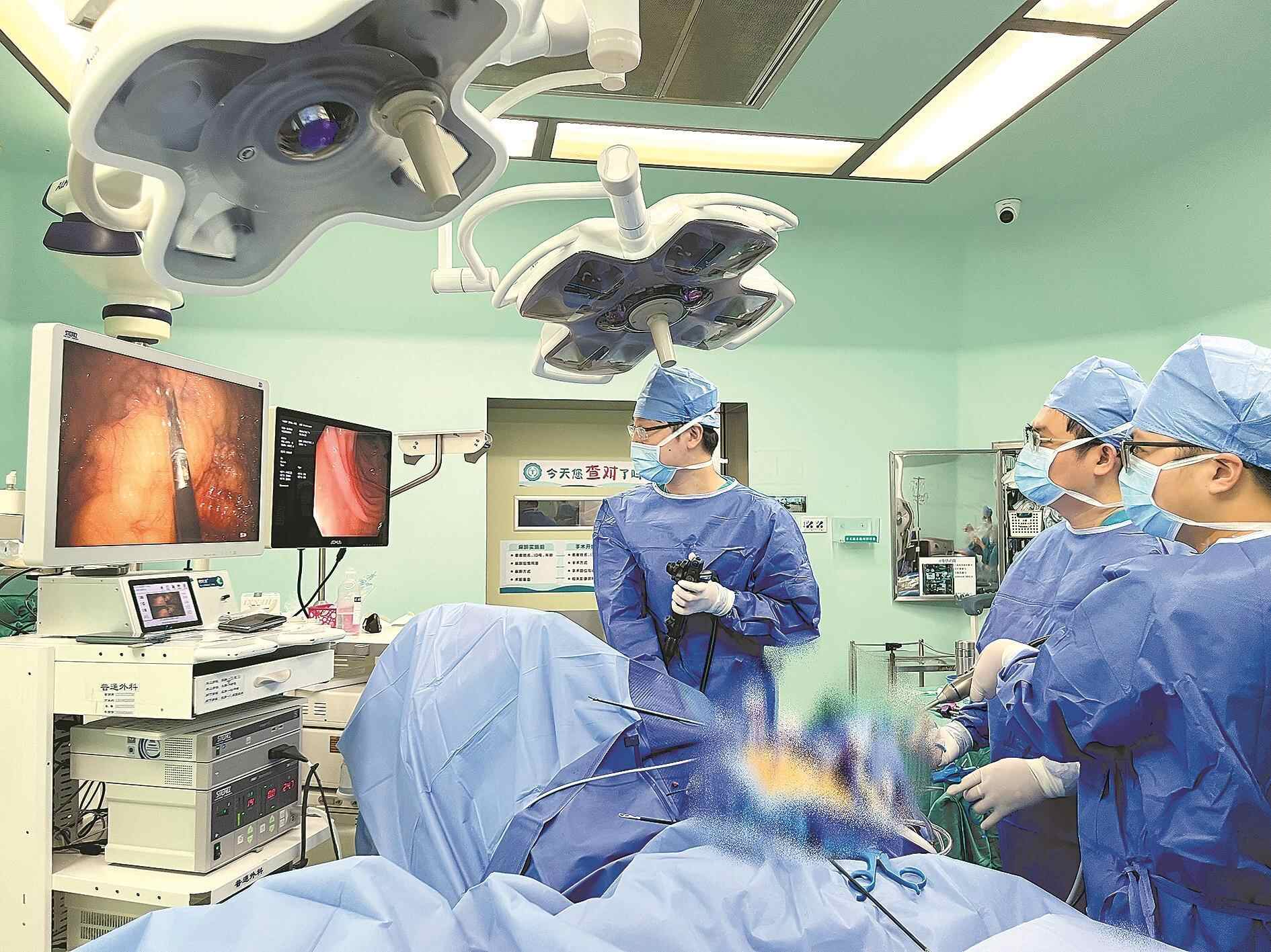 直肠肿瘤距离肛门越近,手术难度越大,能保留肛门的机会也越小。当肿瘤紧贴肛门,切除肛门是否是唯一选择?“没有保不住的肛门,不管多低,只要有机会,我们一个都不想放弃。”珠江医院胃肠外科副主任医师谢朗说,像张女士这样的超低位患者,过去保肛率不足30%。随着医疗技术进步,珠江医院胃肠外科团队不断优化探索新的技术,通过完全腹腔镜下适形切除保肛手术等技术,可实现极限保肛。