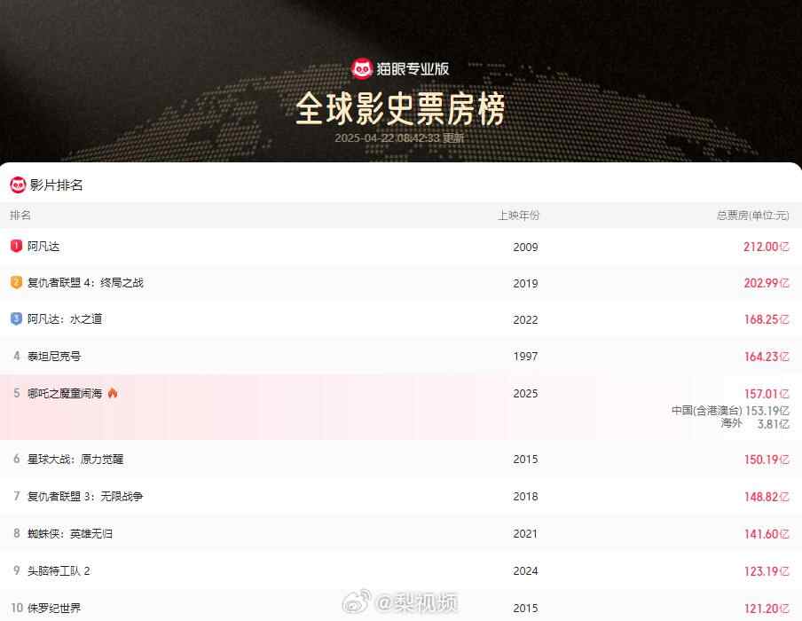 4月22日,据网络平台数据,春节档大热电影《哪吒之魔童闹海》(简称《哪吒2》)总票房已破157亿元,排名全球影史票房榜第五。